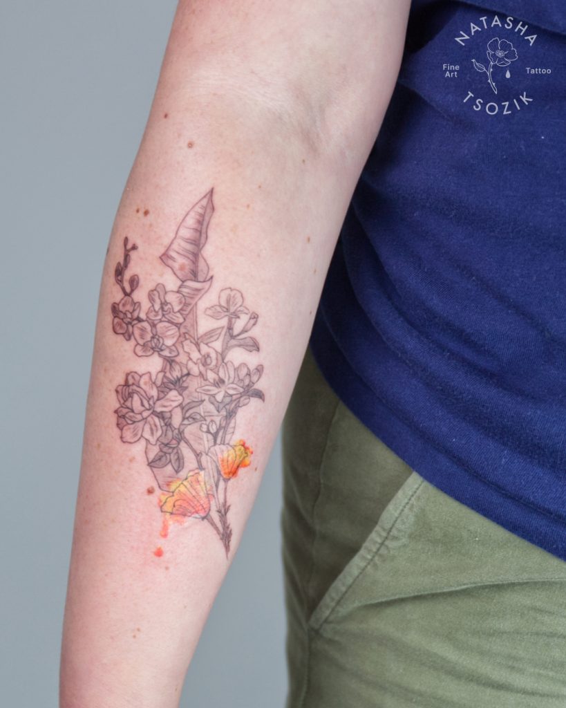 Fresh bouquet tattoo.The 2 months healed result provided by the client.