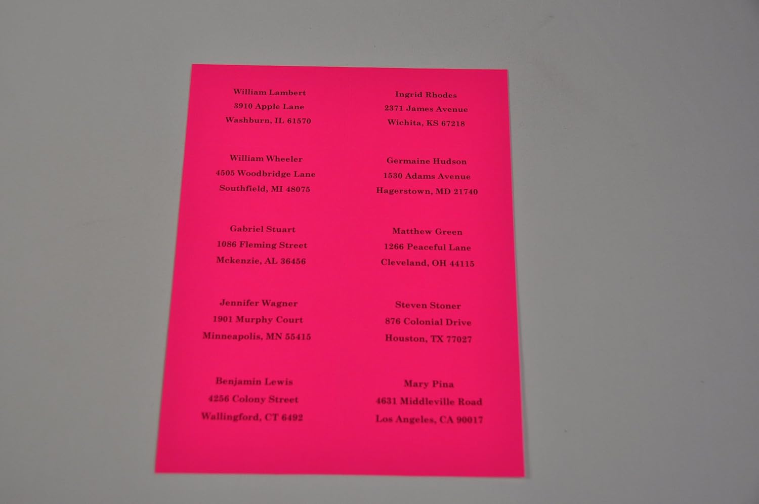 Highest quality Fluorescent Pink shipping label for laser printers, featuring exceptional print quality, strength, opacity and brightness. Labels will not jam or curl. High performance in over 99% of laser printers including HP, Canon and Dell. 3.4 mil face stock with permanent adhesive. Ideal for address, identification, barcode and warehouse labels. Extensive shelf life, one year, when stored at 72 degrees Fahrenheit and 50 percent relative humidity.