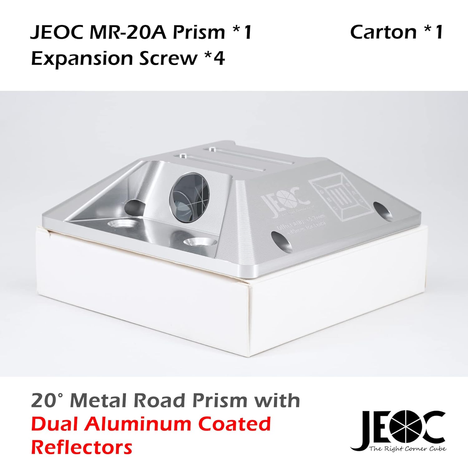 Item Contains: Corner Cube Prism *2 5arcsec Beam deviation Aluminum CoatedHardened Aluminum Base *1Expansion screw *2 Or Embedded Rod *1Constant of Prism A: +5.7mm (+40mm for Swiss Style System) Constant of Prism B: +5.7mm (+40mm for Swiss Style System)