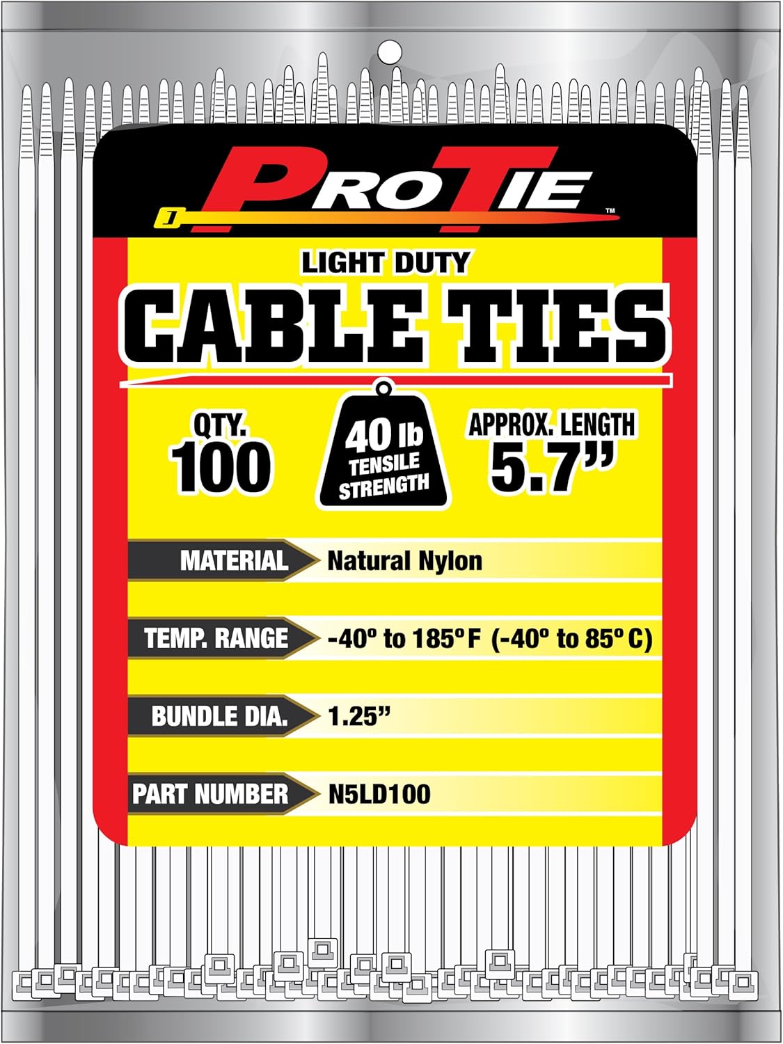 "Most Versatile Tools, with a Wide Range of Applications for Automotive, Construction, Electronics, Home and More!Pro Tie Light Duty, Self-Locking Nylon Cable Wire Ties for Indoor and Outdoor Use | 8.1-Inch, 40 lbs. Tensile Strength, Natural Nylon, 1000-Pack (PN: N8LD1000)Pro Tie Cable Ties come in a variety of sizes, colors, and strengths to accommodate infinite applications and are made from 6/6 lightweight nylon or stainless steel. We have them as small as a few inches in length and as large as several feet. They come in a variety of fastener types to accommodate many applications and needs. From button head, double head, arrowhead push mounts, tear away, screw mount, ID tag, releasable and more.Anything you need secured? Pro Ties has the perfect cable tie for your needs!Pro Tie Cable Ties work by creating a loop around the objects to be fastened, and then tightening the tie using a locking mechanism. Cable ties are commonly used in a variety of industries, including automotive, construction, electronics, home, garden and much more. They keep wires neat and organized and prevent them from becoming tangled or damaged and can be cut to length using scissors or wire cutters. Easy to use and tighten and are great for a variety of applications both indoor and outdoor.Problems with your ties breaking or brittle? If you are having an issue with brittle cable ties, add about a teaspoon of water (5 ml) to the bag of ties, reseal the bag closed with tape, and allow the cable ties to reabsorb water for 24 hours or so. They will go back to being flexible!Working in really cold temperatures with cable ties? Cable ties become brittle the colder they get. If you are wanting to use cable ties below 32 degrees, you should be using ProTie Frosty Ties which can be used to -4°F (-20°C)!"