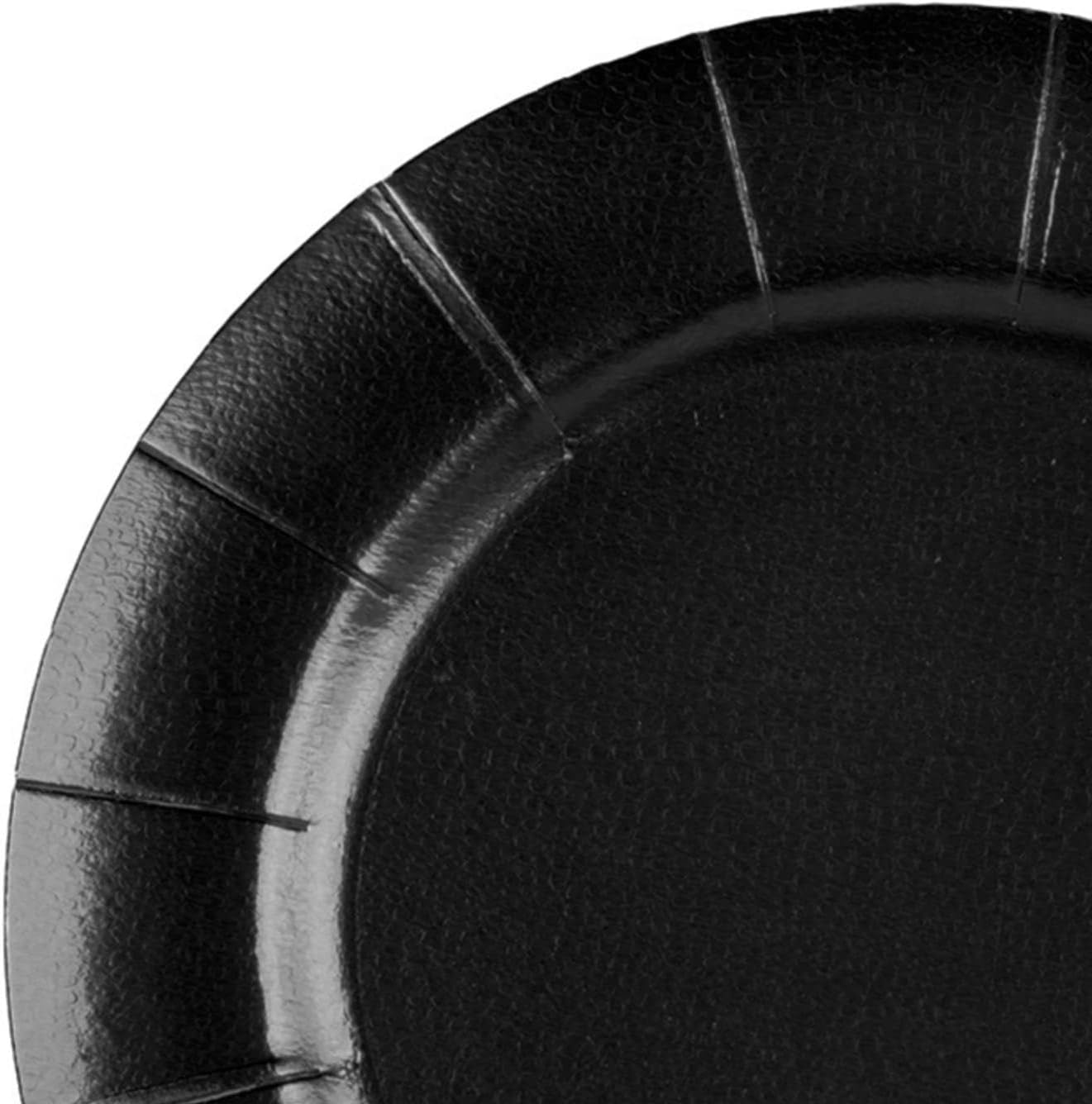 FASHIONABLE STYLE. Your charger is one of the most significant elements of your table. It helps the plate stand out, giving even to the most simple table setting a more sophisticated appearance. These beautiful round silver chargers are not an exception. Its round shape makes it the perfect match for your round plates and creates an amazing tablescape at your weddings, birthdays, showers, Christmas and more. Even better, this charger offers disposable convenience. So you don't have to worry about cleaning at the end of the evening- instead, you can simply throw this paper charger away, and get more time to spend with your guests. DISPOSABLE PAPER CHARGER PLATES. Don't worry about cleanup, when you can enjoy entertaining your guests instead. These charger plates are disposable and recyclable for added convenience, allowing you to set your table to perfection without having tons of dishes to wash later. PERFECT SIZE. Furnishing 13 inches size, this heat-resistant charger plate provides sufficient space for a variety of hot and cold foods alike. Each plate boasts a wide rim to provide easy handling while also preventing any unwanted accidental spills or stains on your table. Chargers are not intended to hold food; rather, they display your plates to full advantage, adding a note of elegance and class to the setup for your event. PRODUCT DESCRIPTIONS †Approx. outer diameter: 13" †Approx. inner diameter: 8 ¼" †Approx. outer rim diameter: 2 ¼" †Case quantity: 120pcs Charger Plates †Color: Black †Shape: Round †Material: Paper †Disposable: One-time, single party use Smarty Had A Party offers the best dinner plate party sets in a variety of colors and packages. Check out our different dinner plate party package variations above!