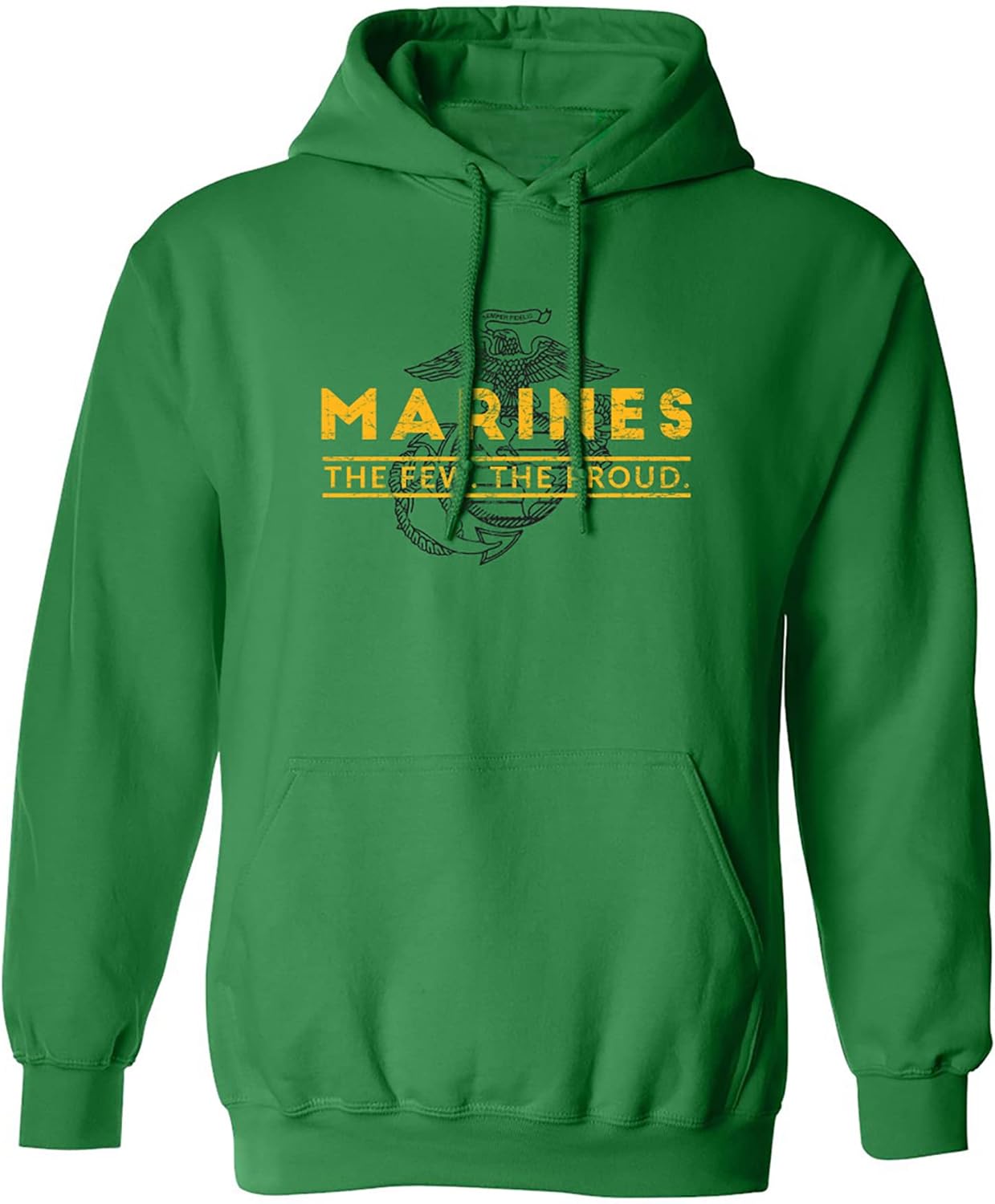This military theme hoodie features "Marines The Few. The Proud." on the front on an Adult Hooded Sweatshirt. Made with a comfortable blend of 50% Cotton and 50% Polyester with a double lined hood, matching drawstring and front pockets. This garment is officially licensed by the United States Marine Corps. Printed in the USA on an imported garment.